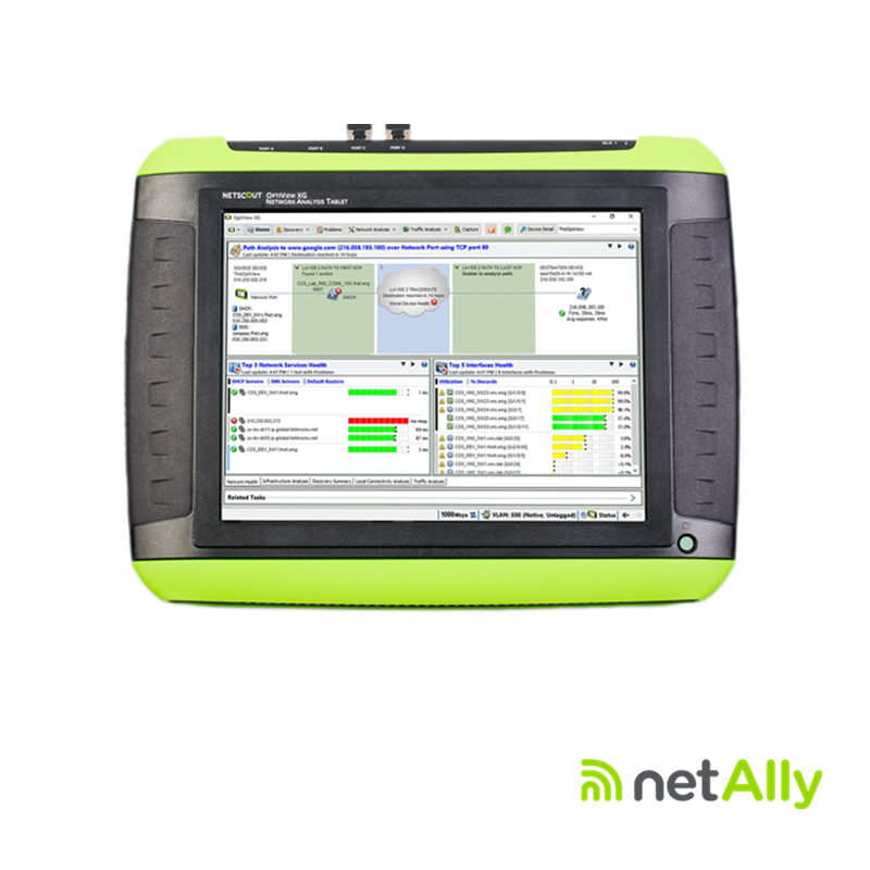 La tableta de análisis OptiView XG permite que la resolución de problemas de infraestructuras de redes Wi-Fi y cableadas se realice por técnicos locales e ingenieros, lo cual proporciona la portabilidad de trasladarse a cualquier lugar. Con descubrimiento automatizado, trazado de mapas de red local y múltiples funciones para aislar la raíz de los problemas relacionados con la infraestructura. Así mismo, los ingenieros ubicados en la sede o en el centro de datos pueden obtener acceso al analizador de forma remota para resolver problemas de colaboración o para el análisis directo de la zona de problemas cuando no hay personal in sitio.